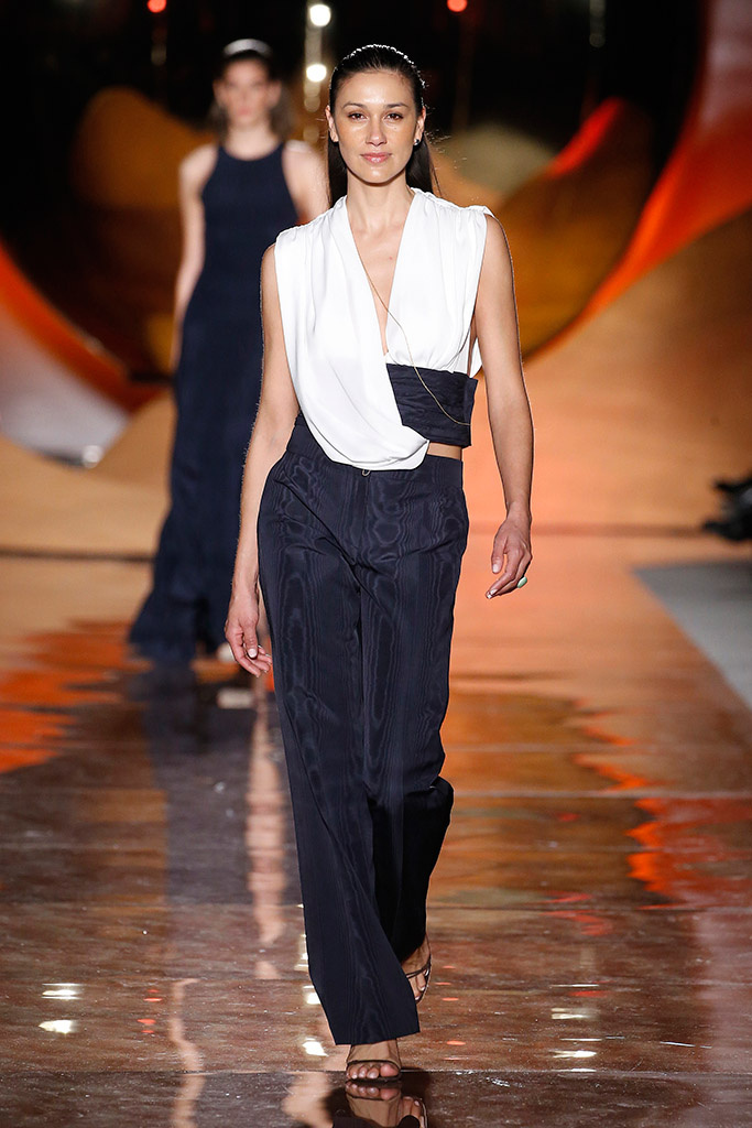 Sobre la pasarela, dos colores destacados: el naranja y el azul. En general, los tonos tierra, que van desde el marrón al nude pasando por el coral, sirvió también de trasfondo en la escenografía, además de en los estilismos. Los diseños son, ya sea en vestidos largos o en trajes, fluidos. Más bien anchos, ligeros, con telas de acabado satinado, que generan comodidad a simple vista y de aspecto muy sofisticado.