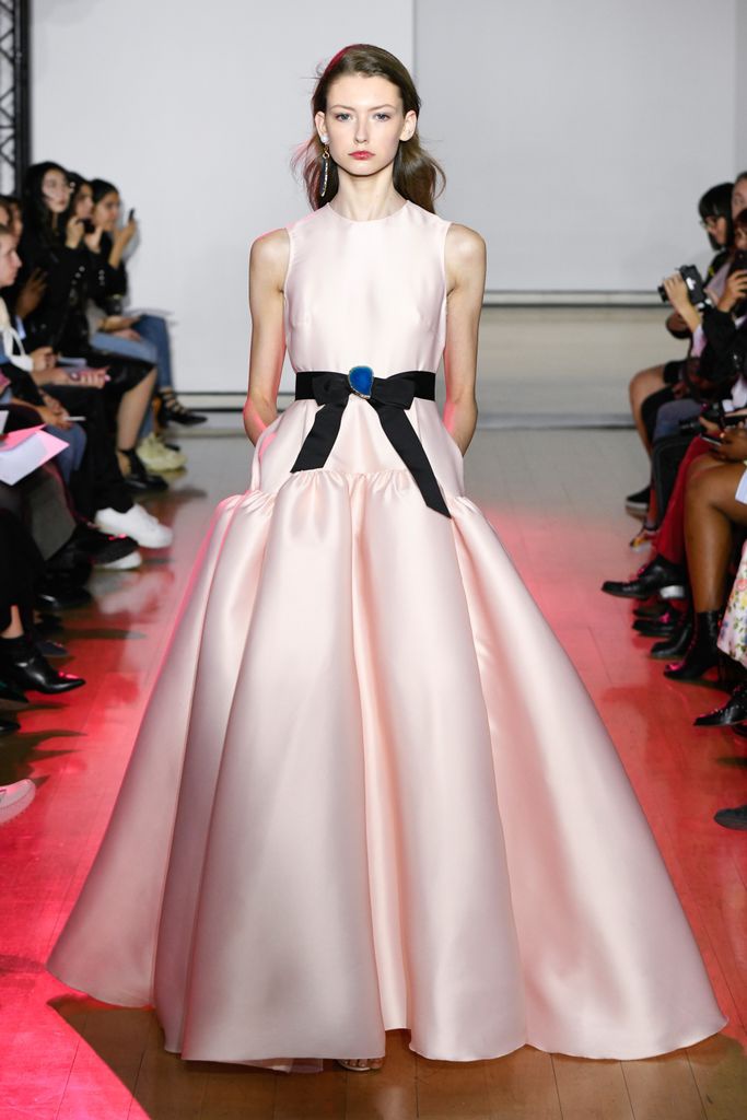 La estética aniñada se ve en esos looks en los que predomina el rosa, casi translúcido, en delicadas y románticas piezas como vestidos de manga larga con bordados en otros tonos, en prendas de acabado satinado, como el vestido por la cintura con volantes en un lateral o el de corte princesa, pero sobre todo en prendas de gasa. Este material también acoge a otro de los colores del desfile, el azul, en prendas muy delicadas y de inspiración lencera, además del negro, también presente en trajes.